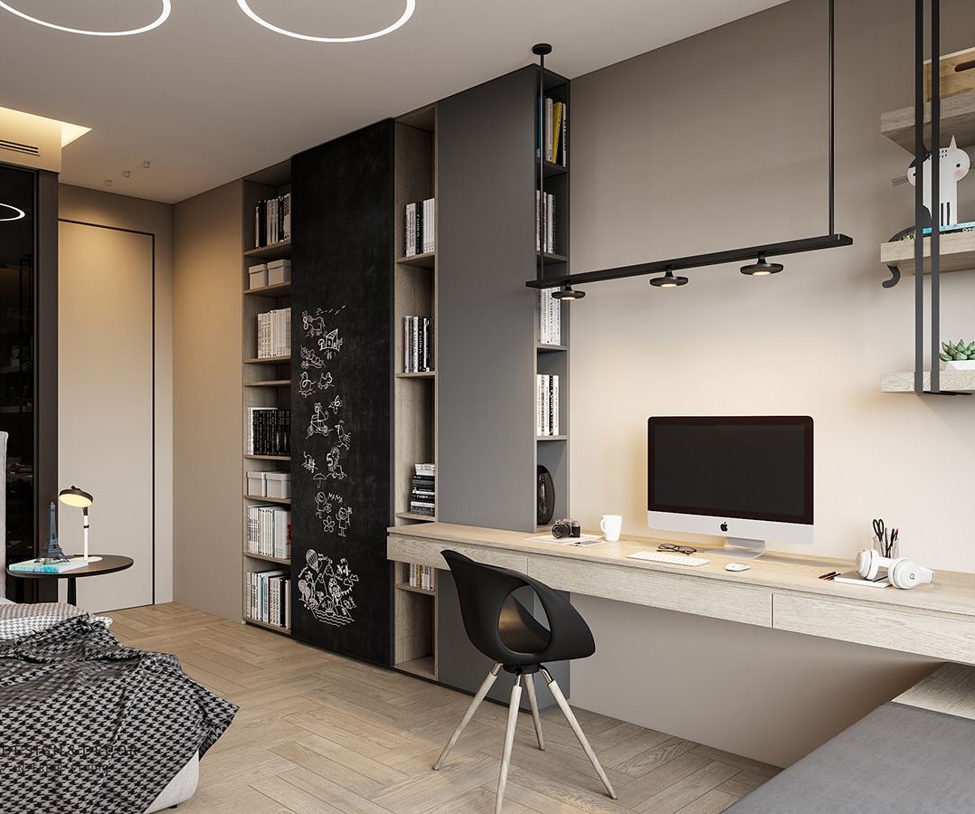 Đặt bàn làm việc tại phòng ngủ giúp các sinh hoạt thoải mái hơn.
