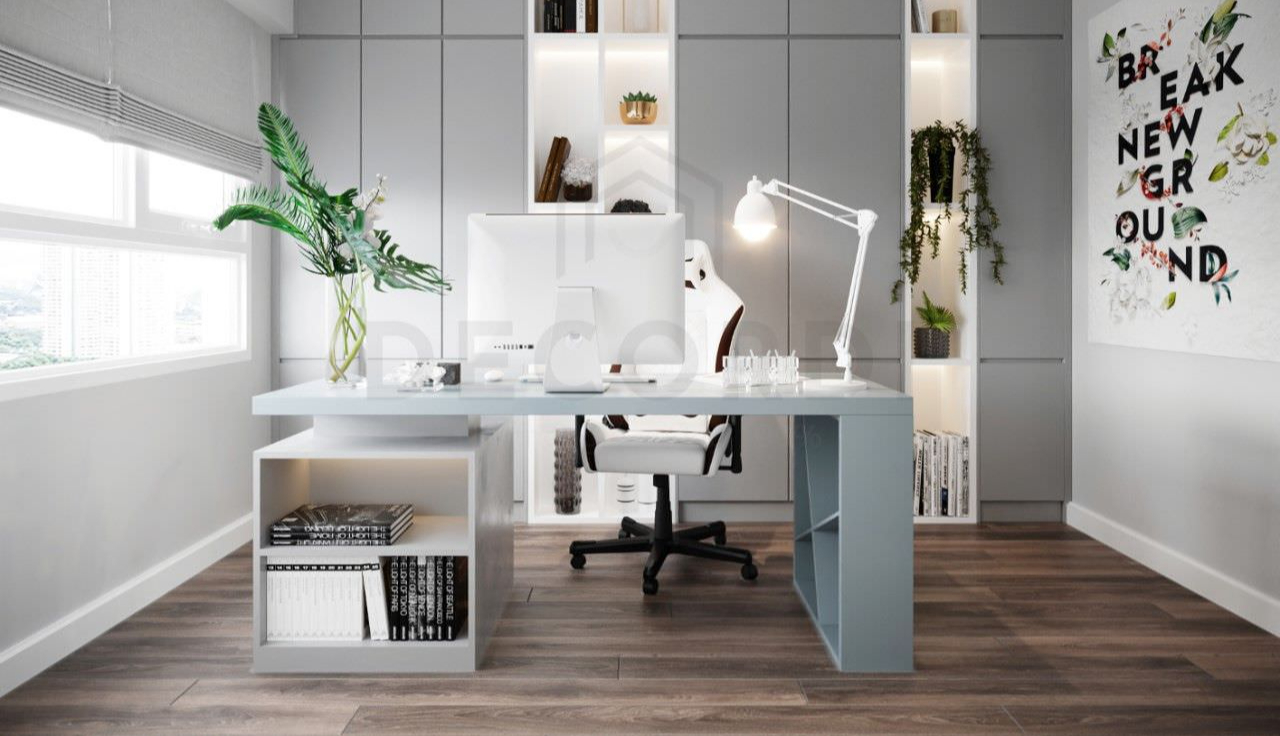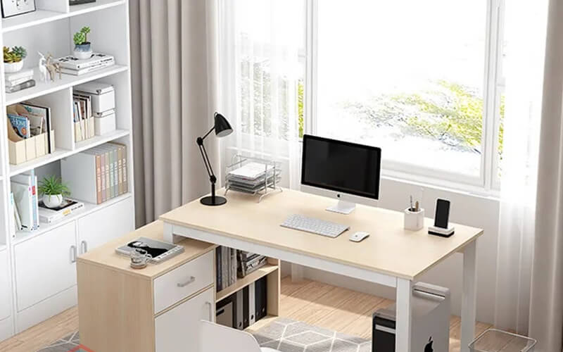 Sử dụng bàn làm việc có ngăn kéo hoặc giá đỡ: Giúp bạn tổ chức đồ đạc gọn gàng, tránh tạo cảm giác lộn xộn trong không gian sinh hoạt chung.